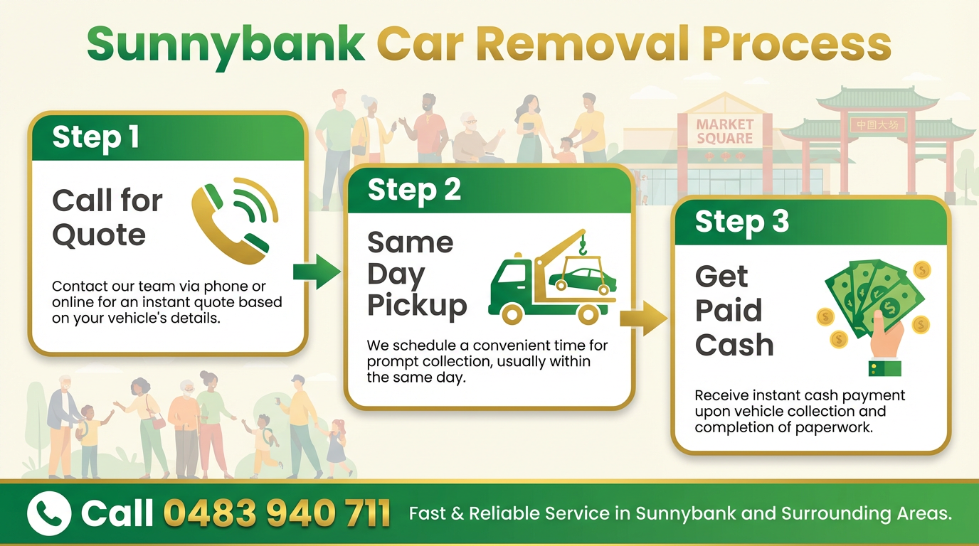 We offer completely FREE car removal throughout Sunnybank and surrounding areas. No hidden fees, no towing charges - just fast, free collection of your unwanted vehicle.